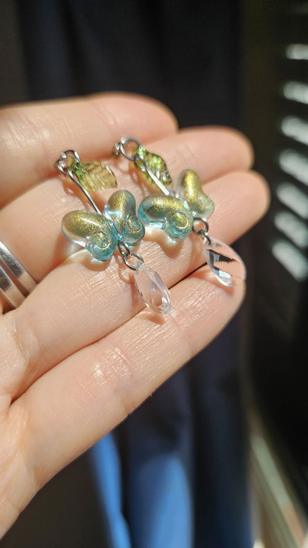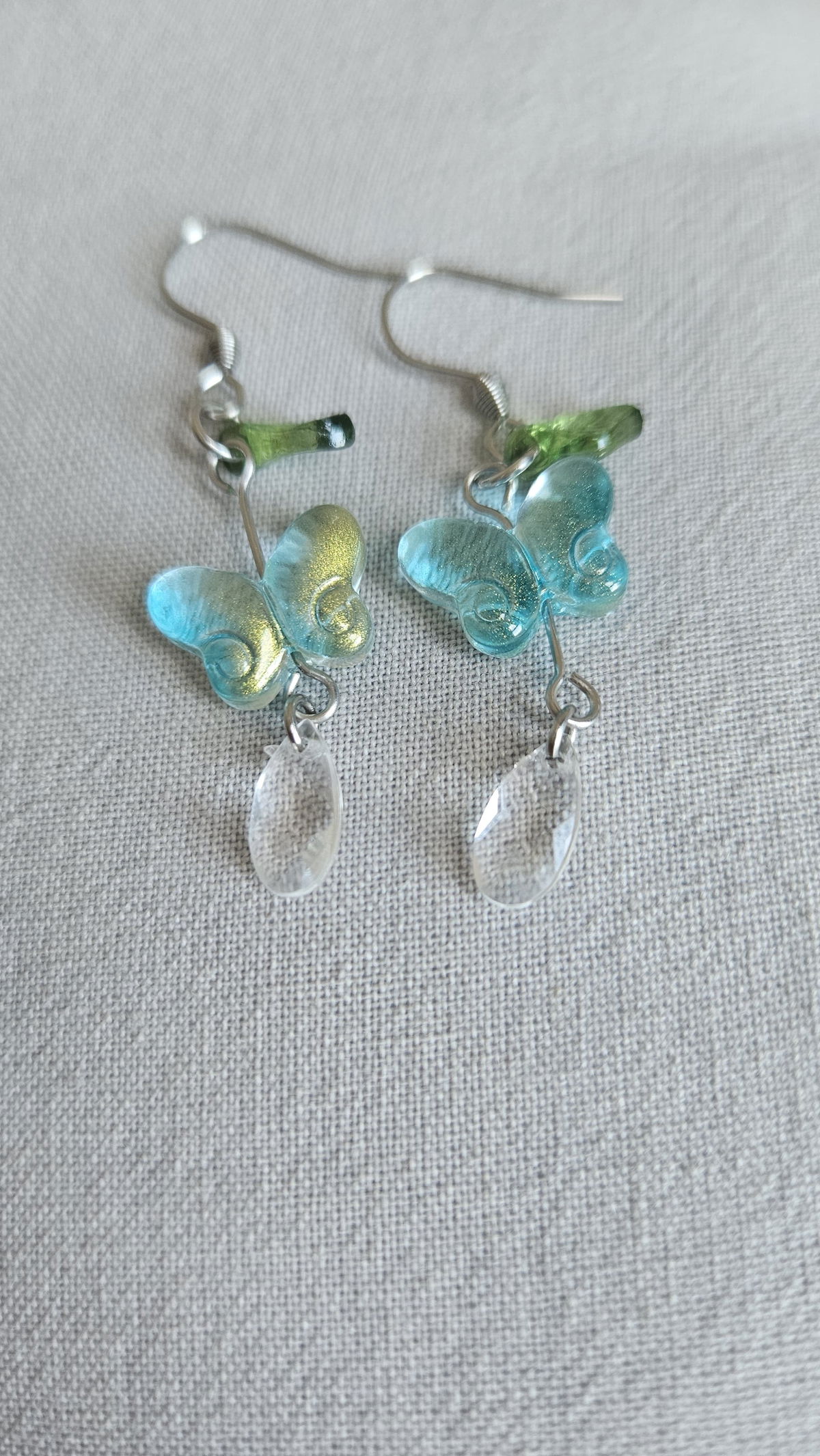 Arito con dijes de mariposa en cristal, hojas acrilicas y gotas acrílicas transparentes
