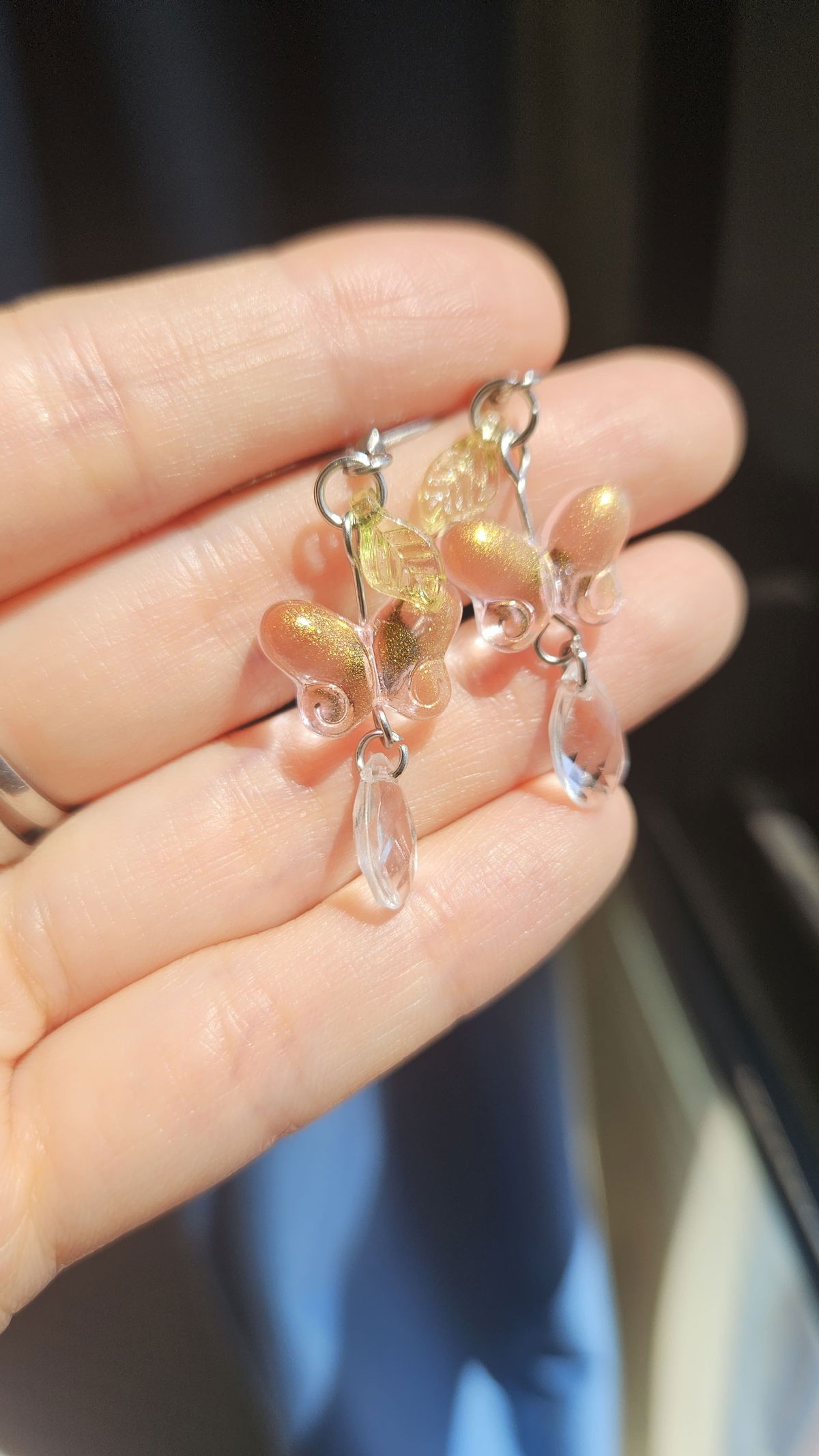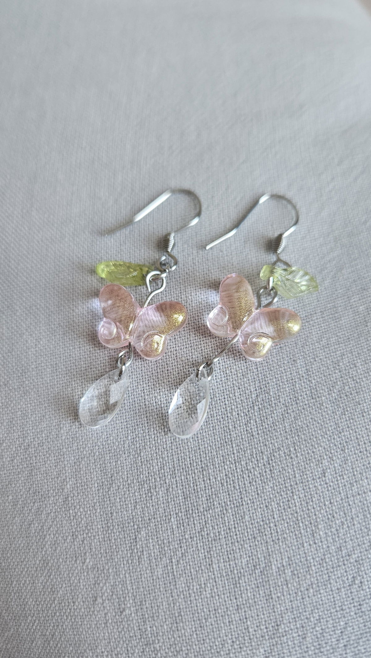 Arito con dijes de mariposa en cristal, hojas acrilicas y gotas acrílicas transparentes