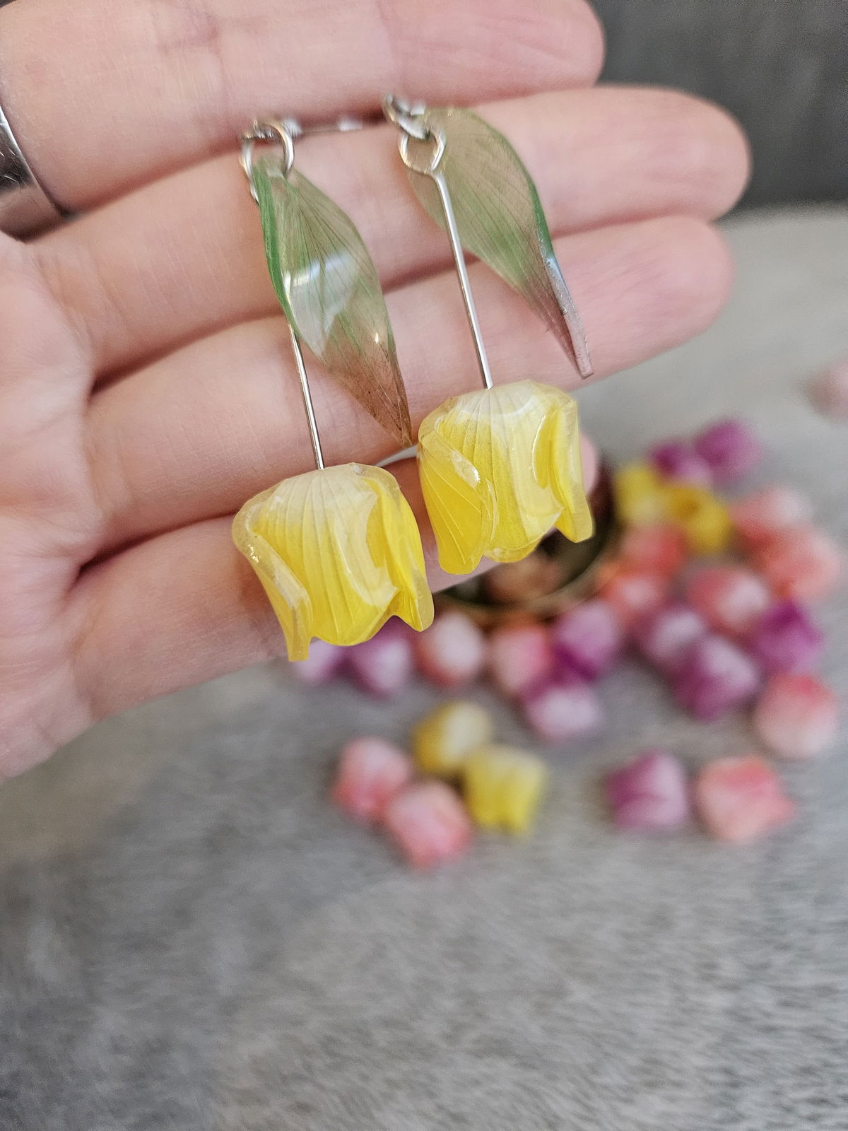 Cada tulipán y hoja están hechas a mano con plástico retractil.