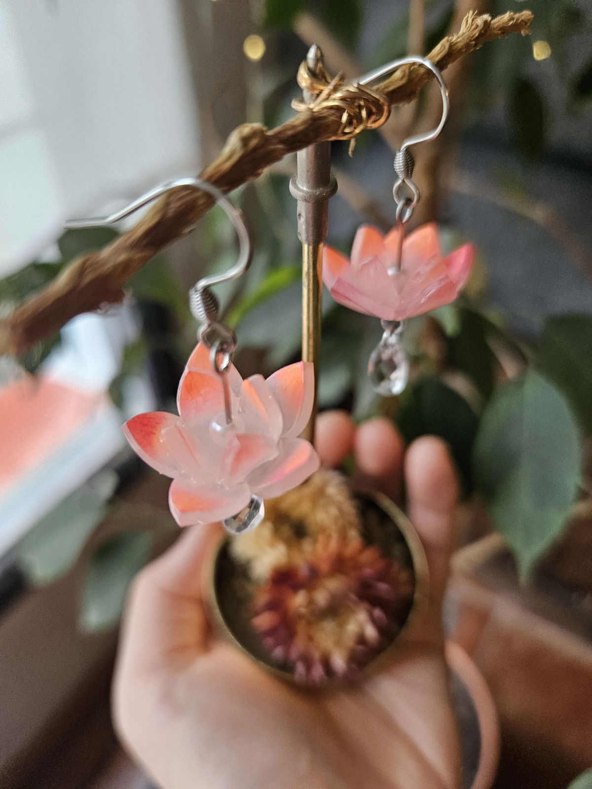 En el centro lleva una perla color blanca y de ella cuelga una gota de acrílico fasetado transparente.